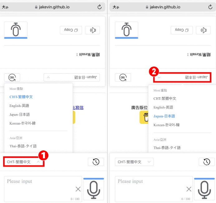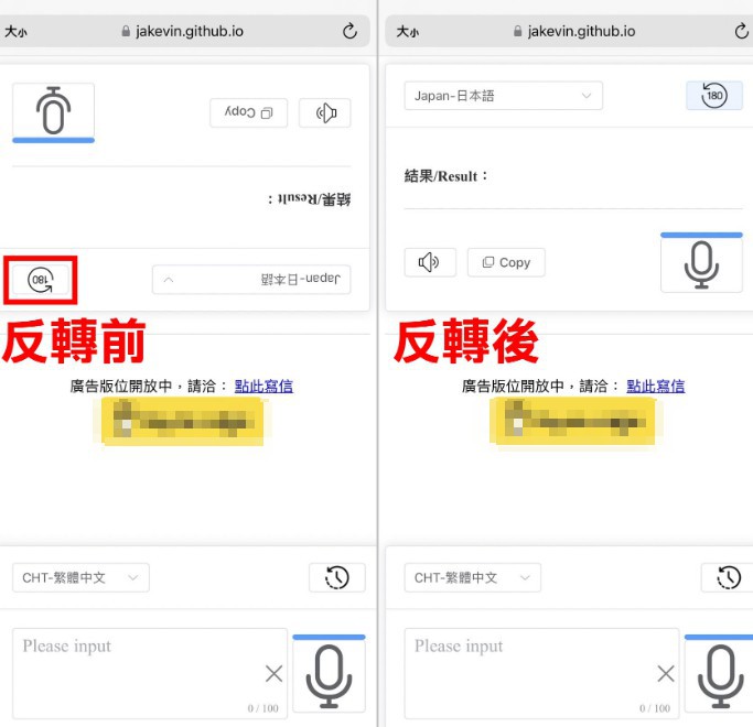 打開 GPT 旅行翻譯器網頁之後,就會看到畫面,雙向都有翻譯功能,一個面向你,另一個面向對方,方便雙方閱讀。另外這翻譯器是串接 ChatGPT,不是 Google 翻譯這種免費服務,開發者完全免費讓大家使用,因此會有廣告,有時候還會有彈出式廣告,這部分就要接受一下。