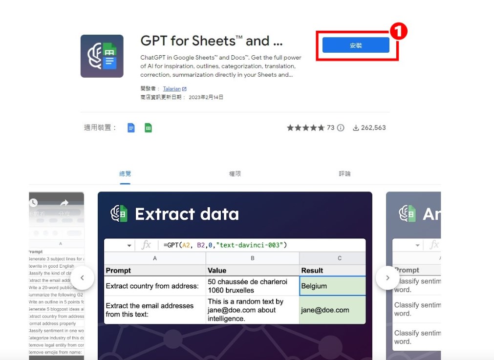 1.先去Google線上官網,找到擴充功能「GPT for Sheets™ and Docs™」,點選[安裝]