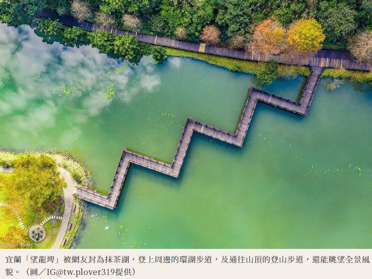 這處綠色湖泊其實是位於宜蘭員山的「望龍埤」,因數百年前山洪爆發而形成一座天然的山中湖泊,湖水主要仰賴雨量的多寡,因此地方耆老將其取名為「望龍」,祈求雨水豐足。接近五公頃的望龍埤三面環山,湖光山水如夢似幻,仔細一看還能發現有鴛鴦在埤塘裡悠遊,十分優美愜意。