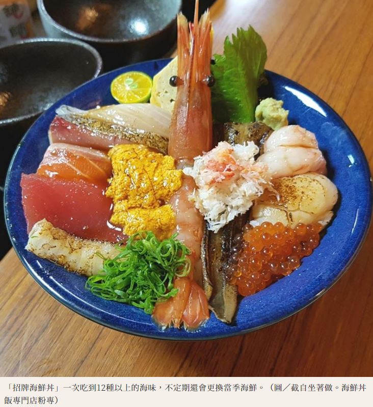 其中「海鮮丼飯店」標榜醋飯無限續、味噌湯喝到飽,不收服務費也適合一人享用,價位落在190~590元之間,每一碗都有滿滿的鮮美海鮮遮蓋住米飯,熱銷NO.1「招牌海鮮丼」集結牧丹蝦、海膽、干貝、星鰻、鮭魚卵、蟹肉等奢華食材,仔細數一數超過12種海味,最近還吃得到限量生食櫻花蝦,顏色繽紛又豐盛的組合,每份580元,令人驚豔!另外「初陣壽司」依壽司貫數分為380、580、680、880元價位,最多可以吃到13貫,網友直言「生魚片新鮮度、CP值都是滿分」、「一樣的份量價格只有台北名店的一半,但是美味卻更加倍」,廣受桃園人青睞。