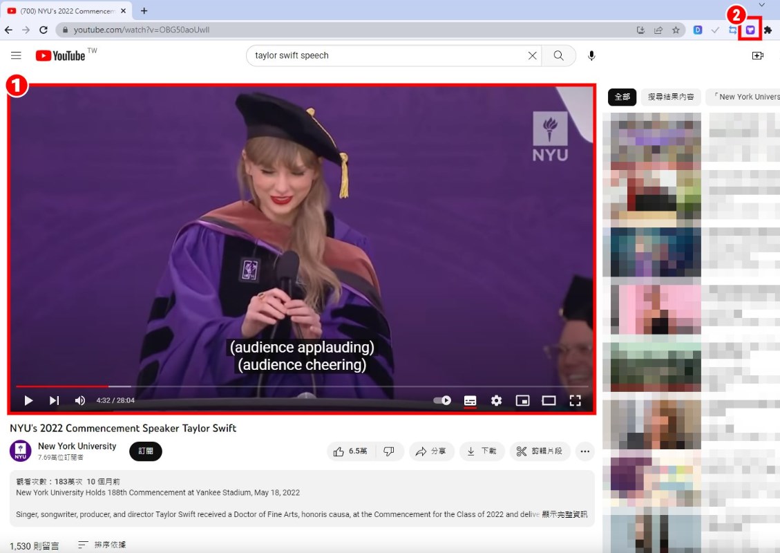 1.找到有CC字幕的YouTube影片(沒有字幕的影片無法使用Trancy)