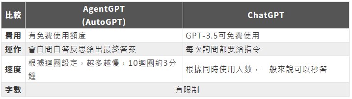 AgentGPT和ChatGPT最大的差別就是它會全自動的一問一答,不用像ChatGPT一樣一直反覆地下新的指令給它,像是同樣都請它們「用繁體中文撰寫介紹ChatGPT的社群文案」,ChatGPT只有給一個單一文案就結束了,相比用「AutoGPT」的AgentGPT,因為在執行迴圈的過程中它會反思,所以除了有給文案以外,還寫了一個社群參與計畫草案和關鍵績效指標(KPIs)列表,思考和回答都更加全面。