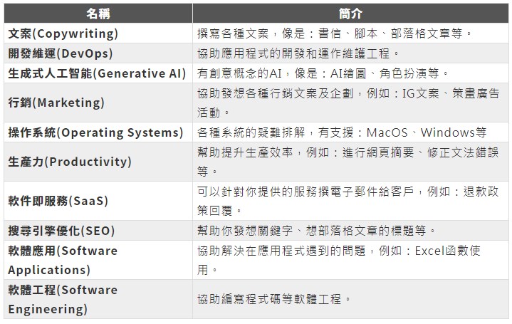 AIPRM擁有的咒語腳本共有以下10個大分類,單純看分類的名字可能也不太清楚他可以幫你做到什麼,下面做了一個表格,跟大家介紹每一個分類: