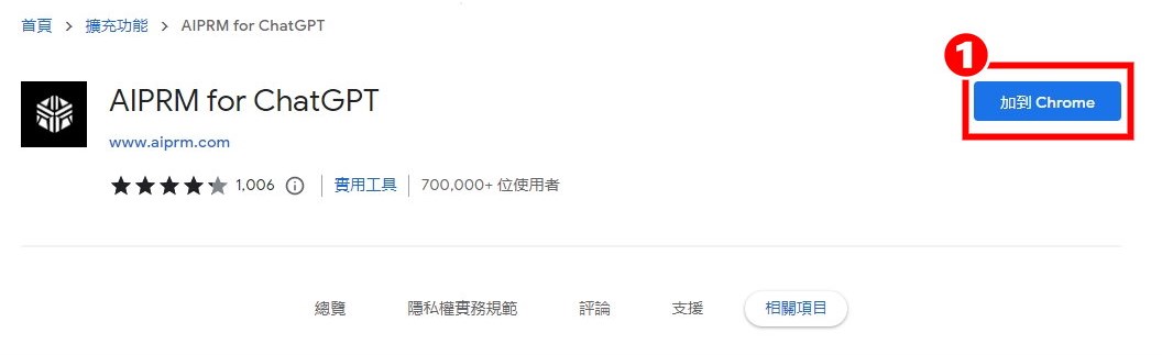 1.進到AIPRM擴充功能頁面,點選[加入Chrome]