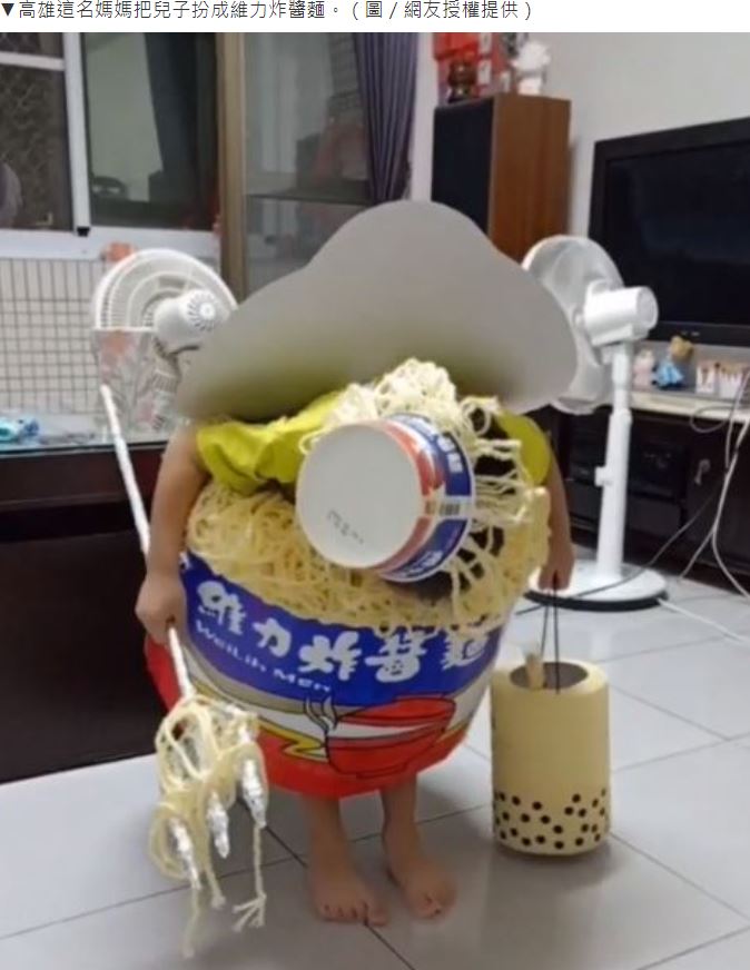 「媽媽根本就是被耽誤的服裝設計師」一名母親在臉書社團「爆廢公社」中PO出作品,「萬聖節…聽說就是家長的服裝設計展」,坦言因為怕鬼所以不扮鬼,乾脆發揮巧思,把孩子扮成食物。她坦言,今年花了一個星期的時間,「麵條一條條的慢慢黏」,總算大功告成了這套維力炸醬麵裝,還製作了一頂維力炸醬帽,這些全部都是她純手工畫出的。除了兒子身上穿的和頭戴的維力炸醬麵外,手上還不忘提了一杯「50嵐珍奶」,網友們看了直呼「好強喔!突然好想吃泡麵喝珍奶」。