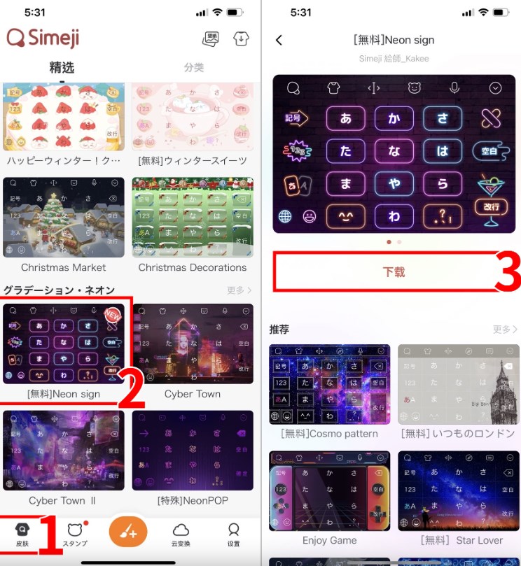 如果你覺得一般白色鍵盤太單調,那我們也可以更改 Simeji 鍵盤的背景主題顏色和圖片喔!開啟 Simeji App 後,切換到「皮膚」分頁,選擇你喜歡的鍵盤主題背景後,點進去並完成下載。然後再開啟 Simeji 鍵盤,可愛的鍵盤主題背景就會自動套用。