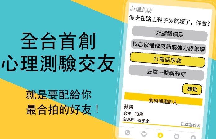 3.問題配對:一開始先回答 1 個心理測驗 + 3 題簡單的選擇題,並設定兩個自己想問別人的問題,透過最一開始的 4 個題目交叉比對出你的配對人選,可以查看對方的基本資料(無照片),喜歡對方的話就給對方 4-5 顆星,(3 顆星以下會自動淘汰),並且回答對方的兩個問題,如果對方滿意你的回答就可以成為好友開始聊天。