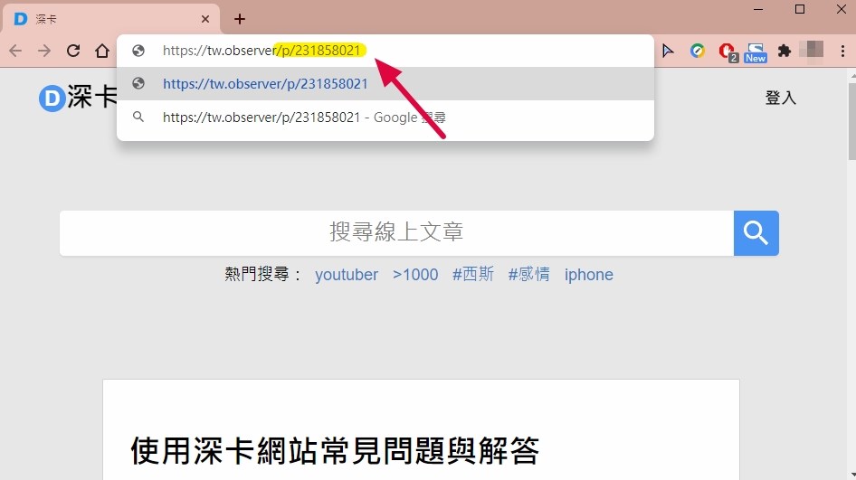 ▼ 進到深卡網站,在深卡網址後貼上剛剛複製的 [/p/文章編號],按下 Enter