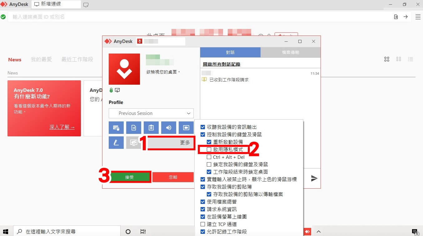 1.遠端電腦收到遠端連線要求,點選[更多]