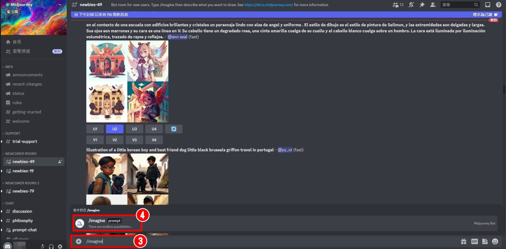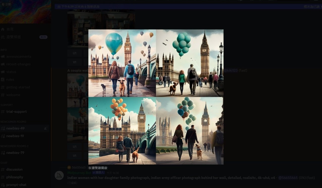 值得一提的是,通過 Discord 的頻道,你還可以看到其他人在生成的作品,從而觀察其他人是如何進行文字描述的以及其對應的結果,可以在他人的作品上進行風格轉換和持續創作。如果有人跟你講Discord可以玩AI繪圖,千萬不要嘲笑他,因為真的可以用「Midjourney」畫出神圖啊!而且不需要有原圖參照,只要用文字敘述就可以產生4張圖片,在玩的時候,也有人直接輸入故事的大綱,請他畫書封喔!