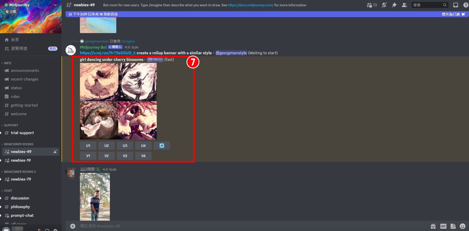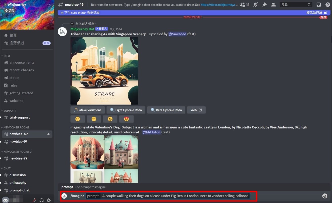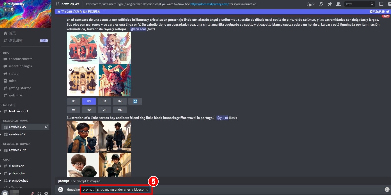 5.輸入一段文字敘述你想要AI畫的圖(必須要全英文),並點選[enter]送進聊天室