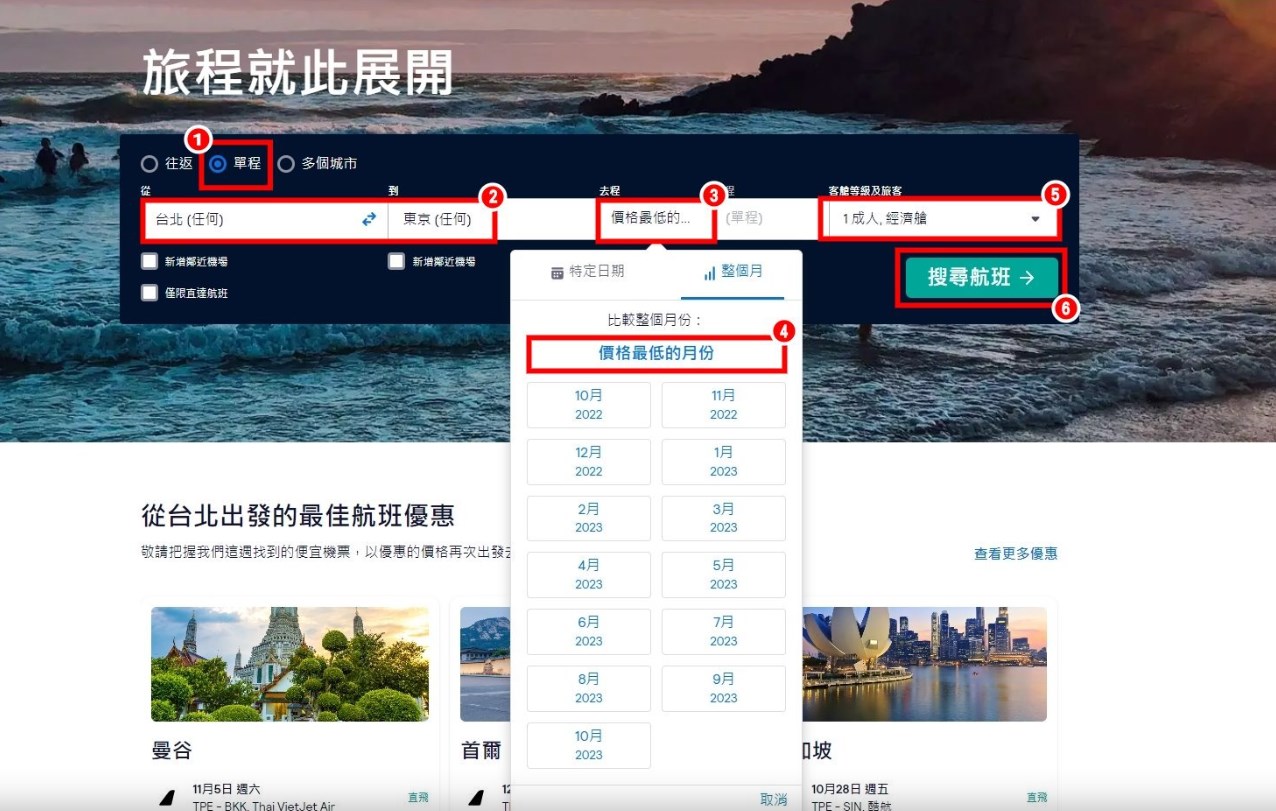 最優惠月份搜尋:還不確定出門時間時,可以透過最優惠月份搜尋找到最划算的機票。