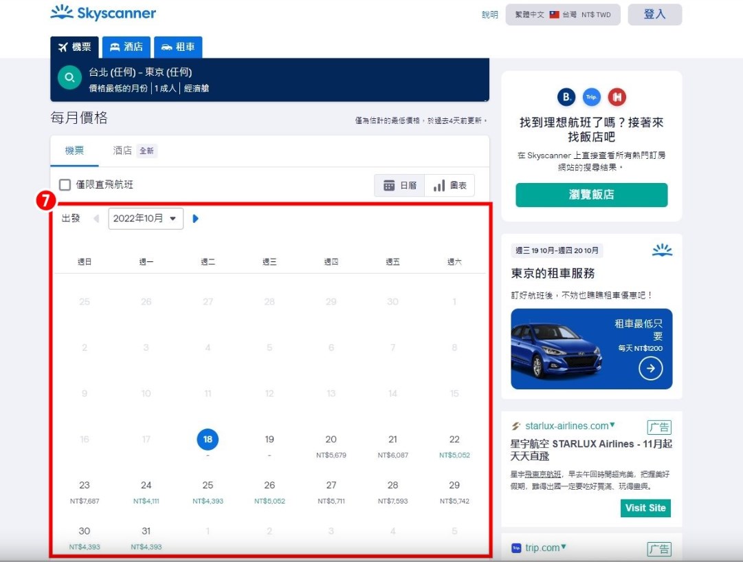 低價日曆:可以顯示搜尋航線每個月的票價,並且標示出比搜尋到的價格更低的日期