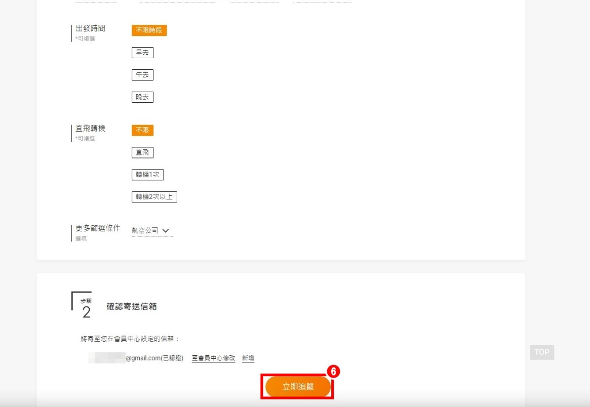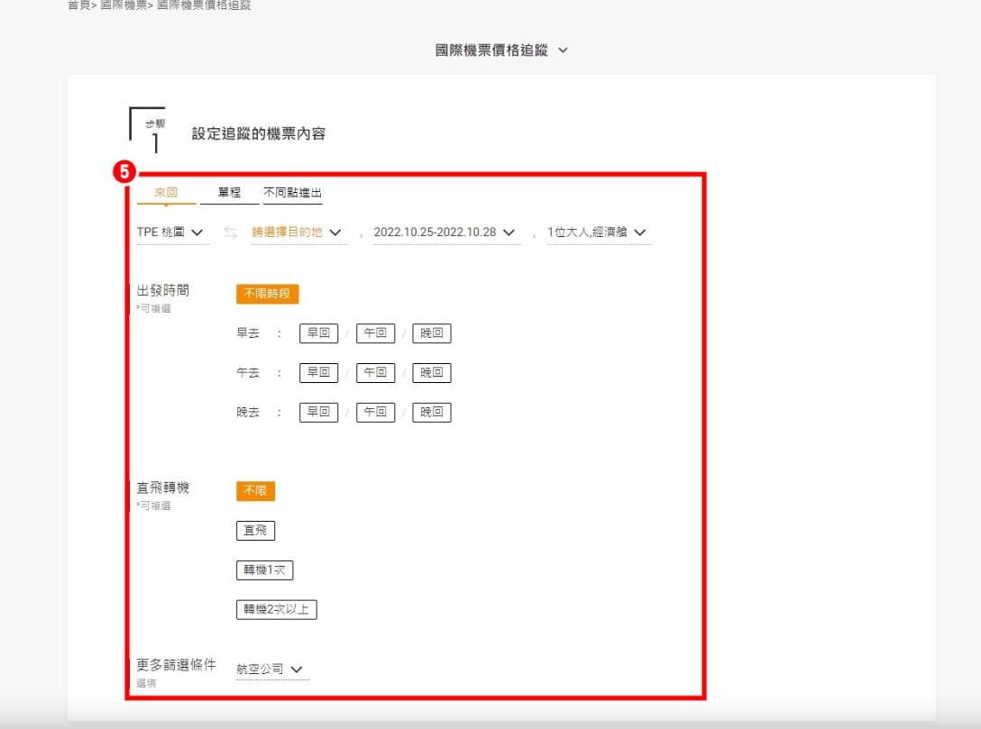 5.設定想要追蹤的機票資訊:航線、出發時間、直飛轉機、航空公司