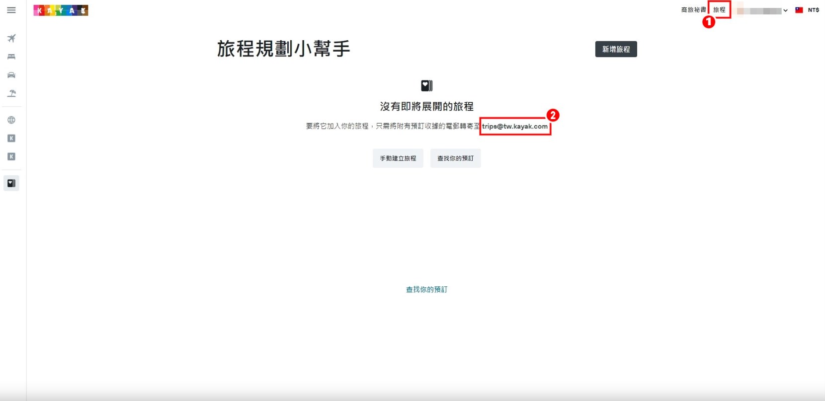 2.將有訂購機票、飯店、租車的電子收據轉寄到KAYAK專屬信箱