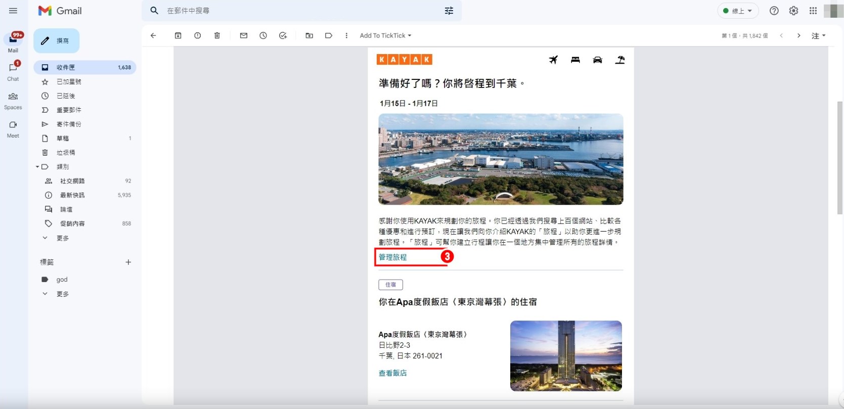 3.幾分鐘後就會收到KAYAK的旅程規劃電子郵件,點選[管理旅程]即可進一步編輯行程