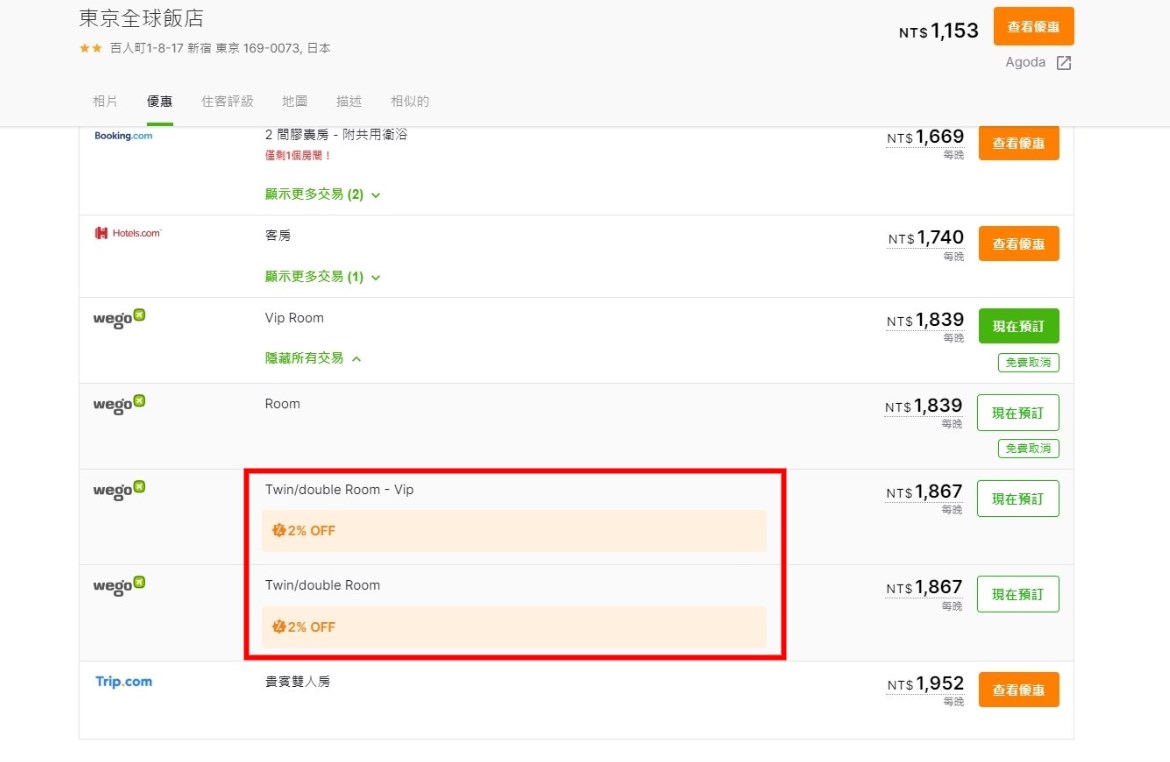 飯店比價:wego也可以統整各家訂房網站比價,部分飯店會提供訂購優惠