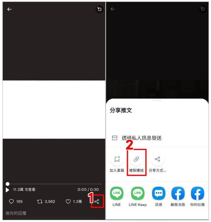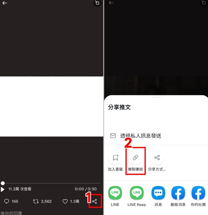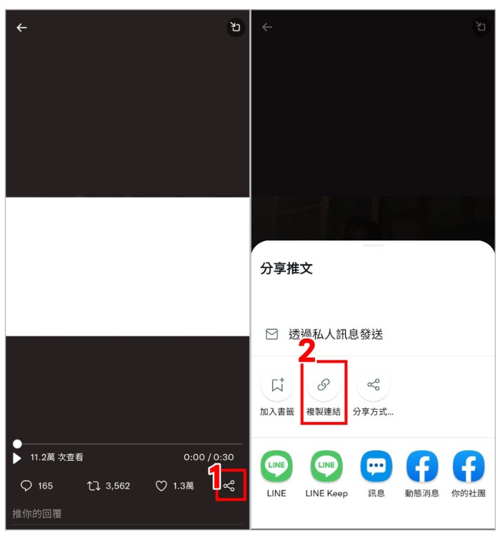 1.在TwitterAPP找到想要的影片,點選右下[分享]