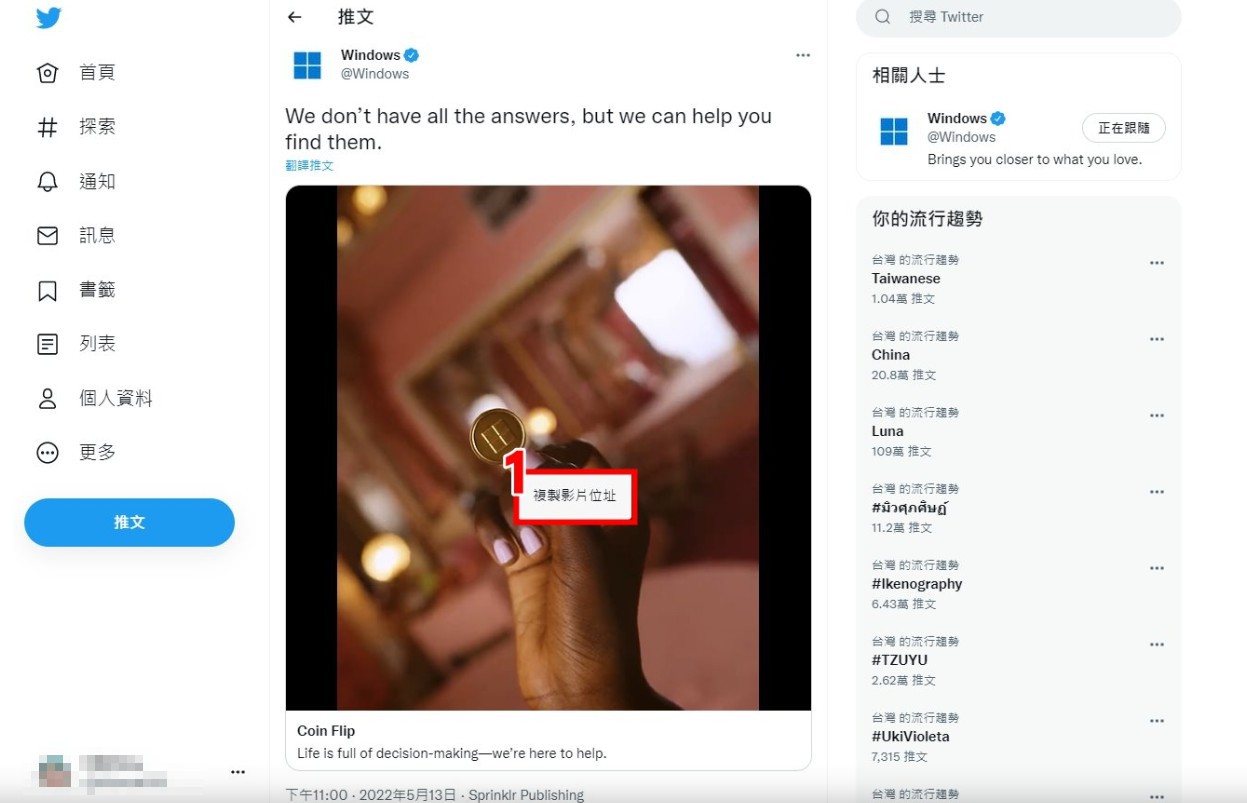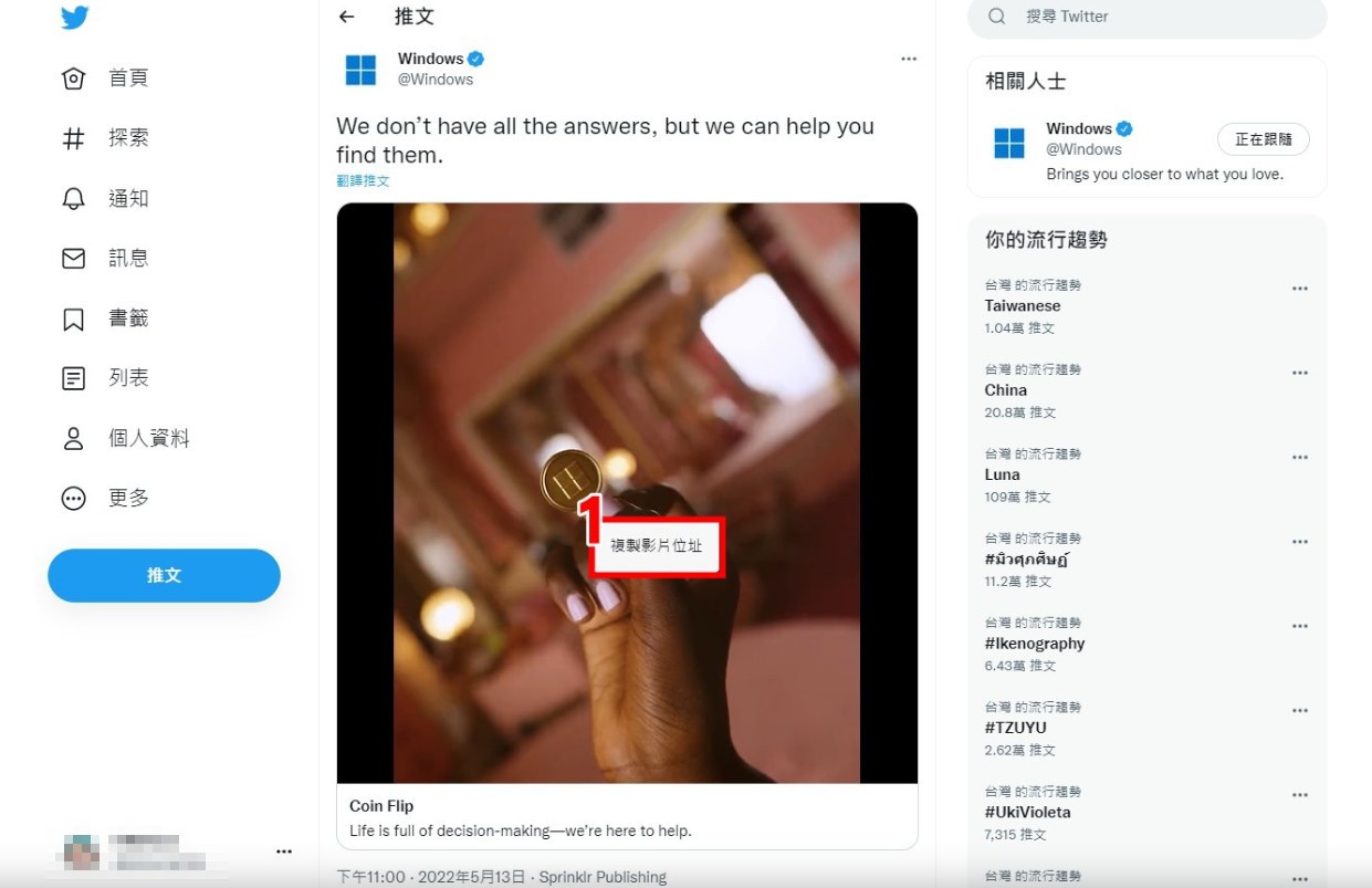 1.在網頁版的Twitter按右鍵,點選[複製影片位址]