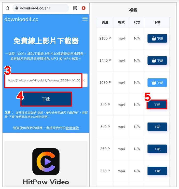 「Twitter Video Downloader」和「Twitter影片下載器」一樣是一個免安裝就可以下載的線上網站,操作方式也是一樣複製網址貼上,不過這個網站可以更進階地分析影片的畫質,提供多個可以下載的影片解析度。