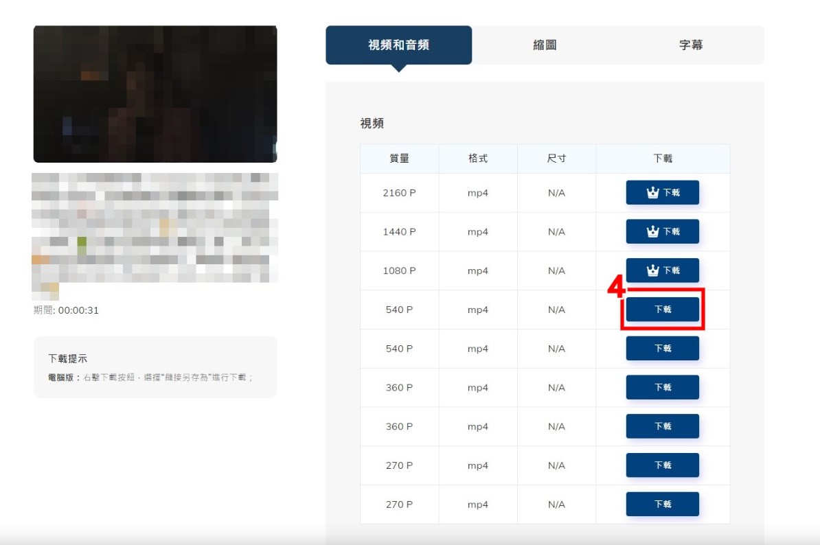 「download4.cc」是個人最推薦的下載網站,除了可以下載影片,也可以下載影片封面圖或是CC字幕檔,功能非常實用。線上網頁板可以下載的最高畫質是720P,如果想要下載更高的畫質,也可以試試安裝「download4.cc」的桌面版喔!