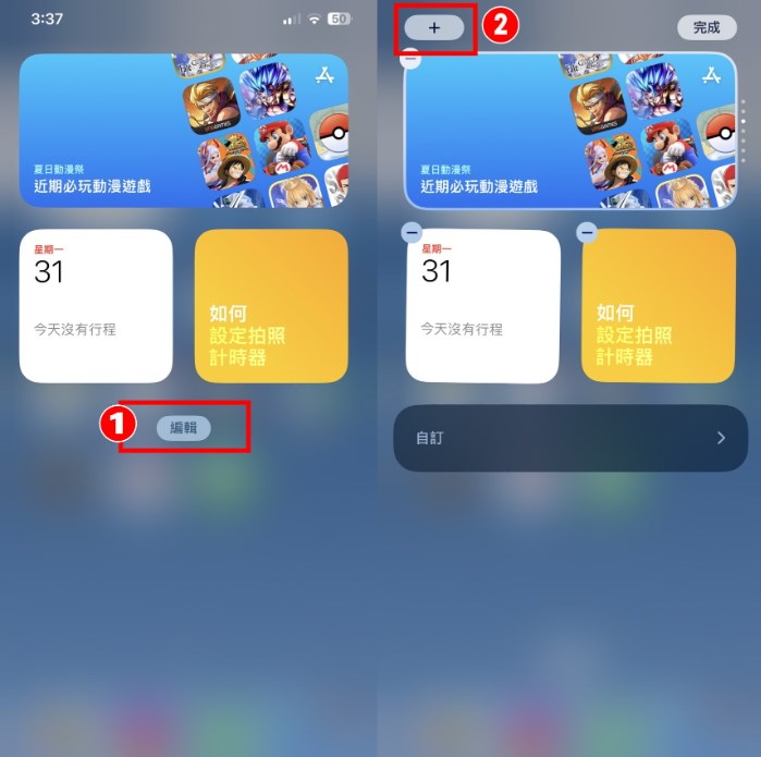 1.長按手機桌布,點選[+號]