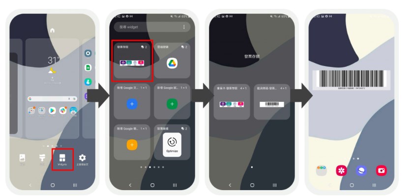 1.在桌面任何空白位置長按後,點選「Widget」圖示