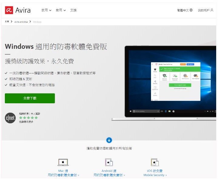 Avast 在全球擁有 4 億使用者,從個人電腦到行動裝置皆有免費版可以使用,且隨時都可以直接升級年費版享受更多防護。Avast 防毒軟體雖然免費,不過防毒能力也是名列前茅。免費版的 Avast 防毒軟體提供了檔案防護、網頁防護、電子郵件防護、瀏覽器防護、軟體更新等基本功能,Avast 免費版對私人使用的電腦來說算是功能健全且實用!