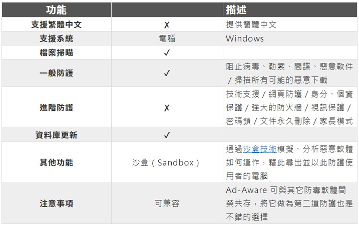 Ad-Aware 是一套由德國 Lavasoft - Avanquest 所開發的防毒軟體,雖然從防堵木馬病毒或惡意廣告等項目出發,但後來融合了即時病毒防護及防火牆等功能,使它防毒的表現也很優秀,而且 Ad-Aware 的操作也是簡單直覺,掃毒十分快速,也是值得一試。