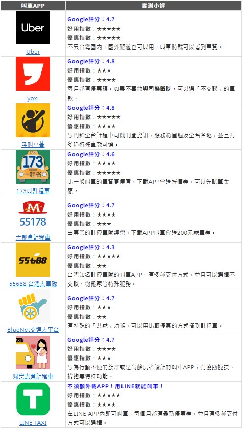 總共10款的叫車App都各具特色,如果是小資族想省錢就要選「173叫計程車」,優惠最多且功能完善,尤其是需要搭乘長途計程車,省下的金額會相當有感!!個人則是最喜歡「Uber」,除了有優惠碼外,在叫車時就直接計算好車程的價錢,搭乘的時候就不會擔心被坑,而且乘車的品質也很用心維護,搭過的Uber真的不管是服務或是硬體設備都非常好!