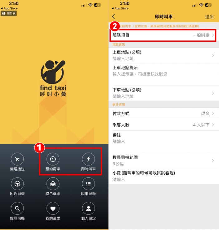 1.可點選[預約用車]或是[即時叫車]進到叫車界面
