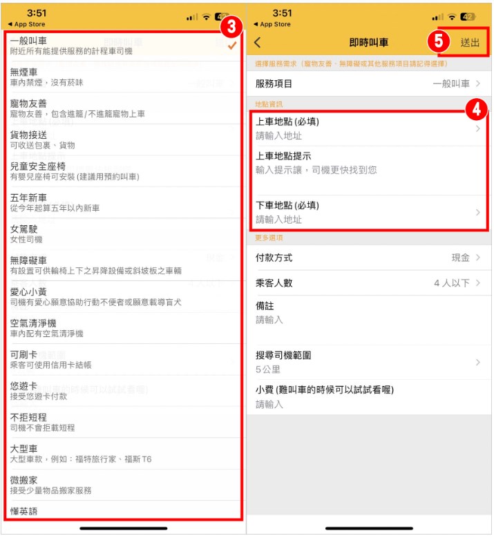 5.確認叫車資訊無誤後,點選[送出]就可以叫車啦!