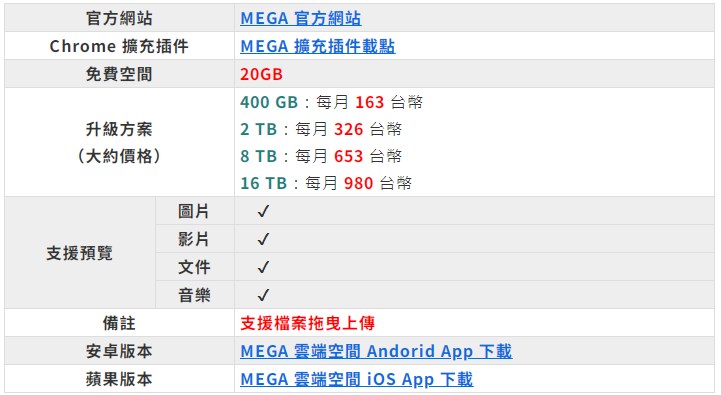 MEGA 是一個免費的雲端儲存空間,早先平台被強制關閉,現在回歸後就朝保護使用者個資的方向做了許多努力,不僅如此,它還提供了 40 多種語言,上傳及下載速度一直以來都算快速,更提供使用者 20 GB 的免費上傳容量!