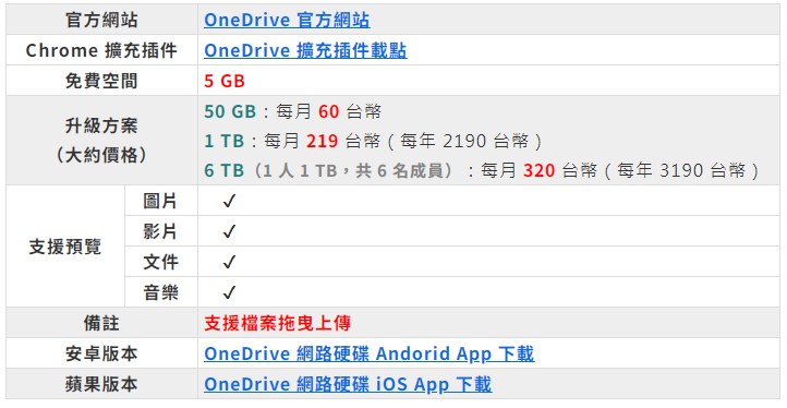 OneDrive 是微軟所推出的網路硬碟及雲端服務,提供免費 5 GB 的容量。使用者可以上傳檔案到網路伺服器上,並且透過網路瀏覽器來瀏覽那些檔案。更可直接編輯和觀看 Microsoft Office 檔案。