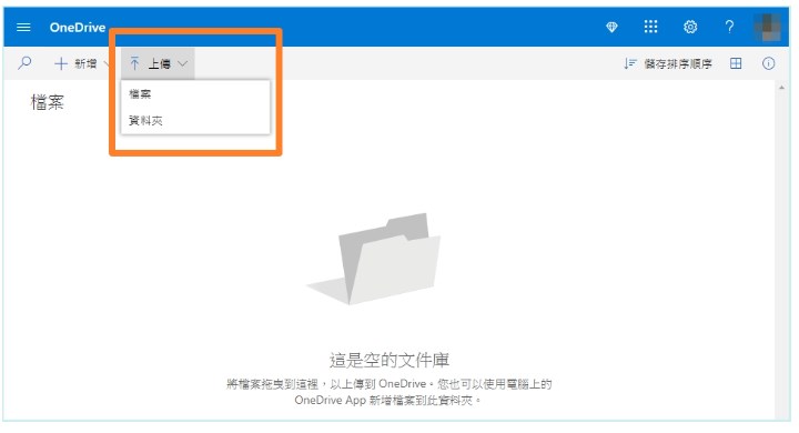 想要上傳檔案,直接在畫面中右上角點選 [上傳],如果想上傳整個資料夾就點上傳右方的灰色資料夾圖示。想要直接拖曳上傳只要將資料拉進網頁中就行。