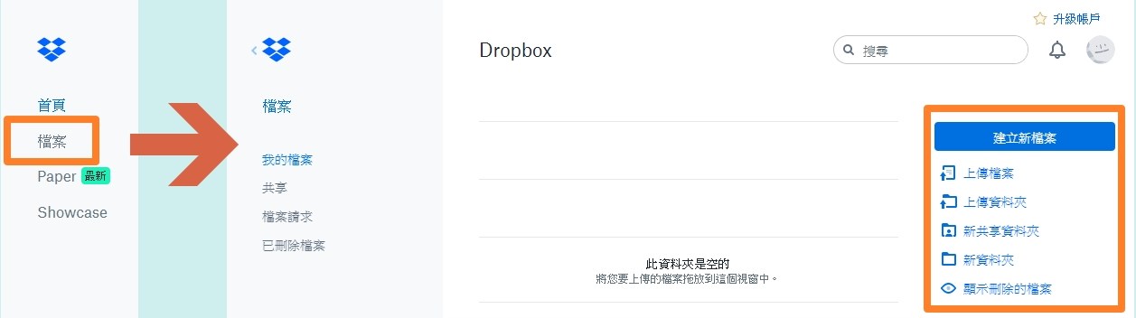 註冊完畢後 Dropbox 會要求你下載應用程式,載不載都行,如果你選擇不要下載,那麼可以直接進到 Dropbox 的官方網站,點選左邊的 [檔案],右方選擇你要 [上傳檔案]、[上傳資料夾] 或是與他人共享資料。