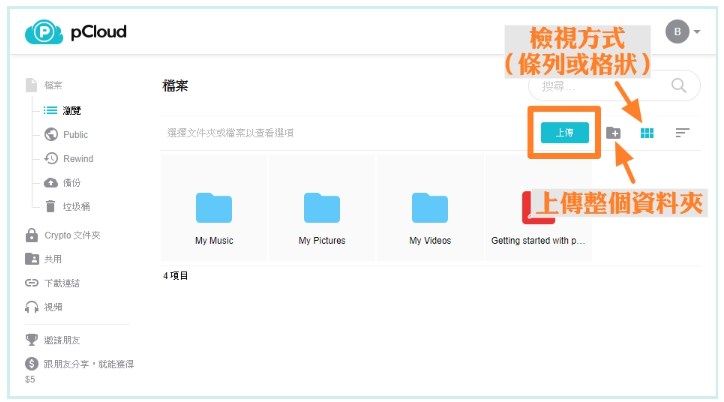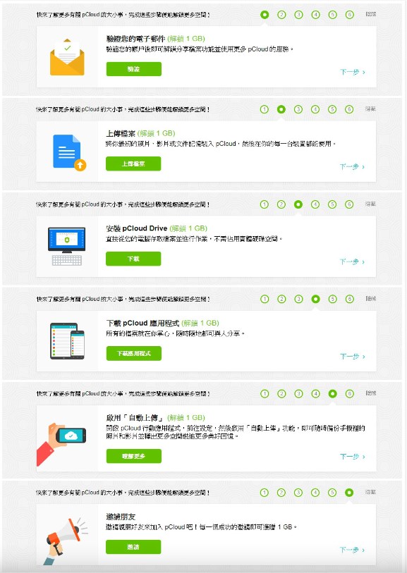 當你建立好帳戶後,pCloud 會要求你下載應用程式,不論是否下載應用程式都可以使用,點選 pCloud 官方網站 進入,畫面上方會出現一個提示欄位,只要完成上面的任務(驗證信箱、上傳檔案、邀請好友一起使用等)就可以獲得免費空間的容量提升!