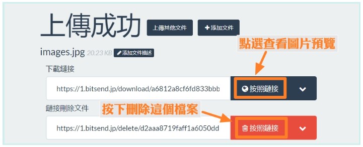 檔案上傳後會產生兩個網址,上方的網址可以複製起來傳給別人下載檔案,下方的網址複製起來,想刪除檔案的時候只要貼上、前往網址就可以輕鬆在另一端刪除檔案。