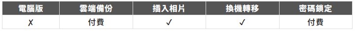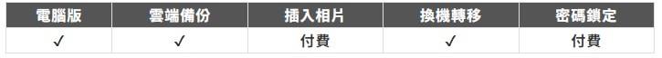 升級項目:照片可以放置最多3張、1個免費的表情豆主題、Google 雲端備份和還原、深度數據報告、移除廣告