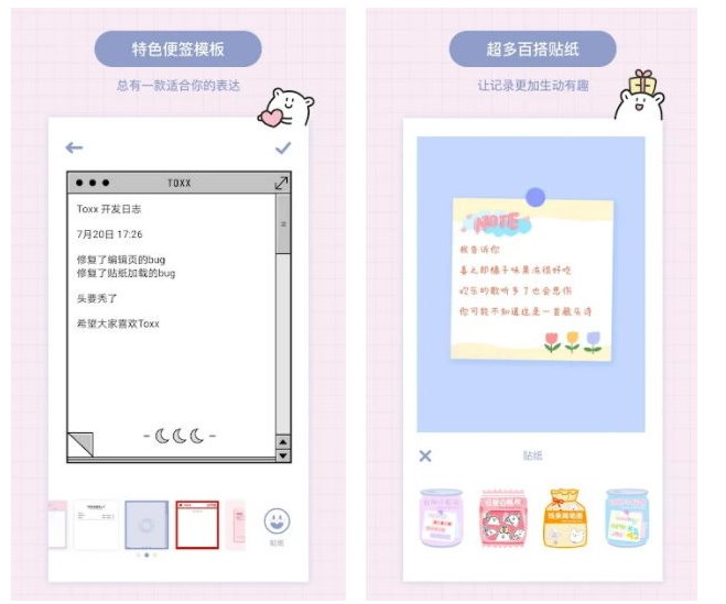 「Toxx」風格多為可愛插畫主題,它能同時書寫日記和製作手帳,並且可以自製日記本和手帳本的封面,也有多款模板提供製作靈感,方便快速記錄生活日常。