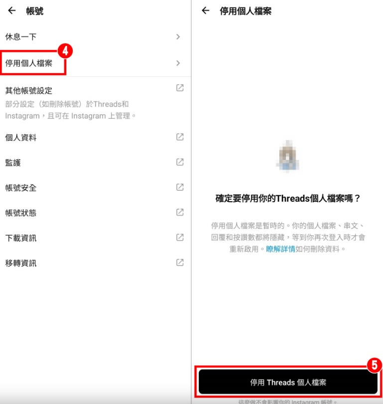 停用帳號:會隱藏你的Threads個人檔案,但是只要重新登入就可以再次啟用。