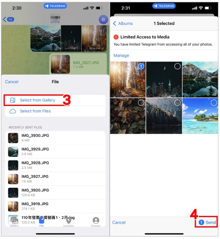 4.選擇想要傳送的圖片或影片,點選[Send]即可傳送原始檔案