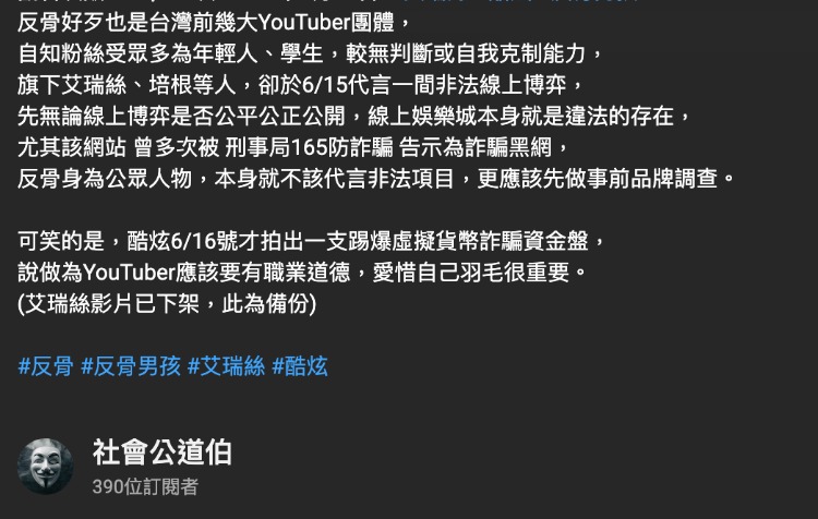 該網友批評,反骨男孩作為台灣頂尖的YouTuber團體,應當進行事前的品牌調查,避免代言不合法的項目。他還揭露,反骨的領導者酷炫在6月16日發布了一段影片,譴責虛擬貨幣的詐騙行為,強調YouTuber應有職業道德和保護自己的形象。然而,艾瑞絲代言的影片於6月21日被下架後,「社會公道伯」已經備份該影片,並呼籲酷炫對此事作出回應。