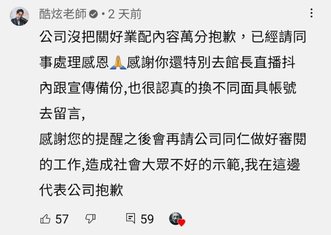 儘管酷炫已公開道歉,他對於網友在多個社交平台上不斷分享艾瑞絲代言的非法線上博弈詐騙網站的行為表示出明顯的不滿。在某些留言中,他的語氣帶有些許刻薄,一部分人認為應該代言前沒注意到,不過對於這段道歉,部分網友無法接受,認為暗酸顯得沒有誠意。