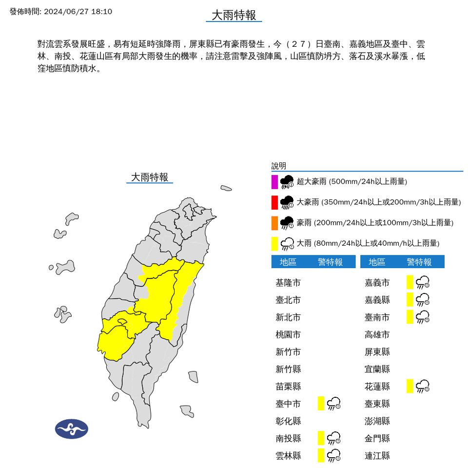中央氣象署今日針對多個地區發布大雨特報,預警範圍包括南投、台中、雲林、嘉義、花蓮等7個縣市。受對流雲系影響,屏東縣已出現豪雨,且預計今日台南、嘉義地區及台中、雲林、南投、花蓮山區有局部大雨發生的風險。