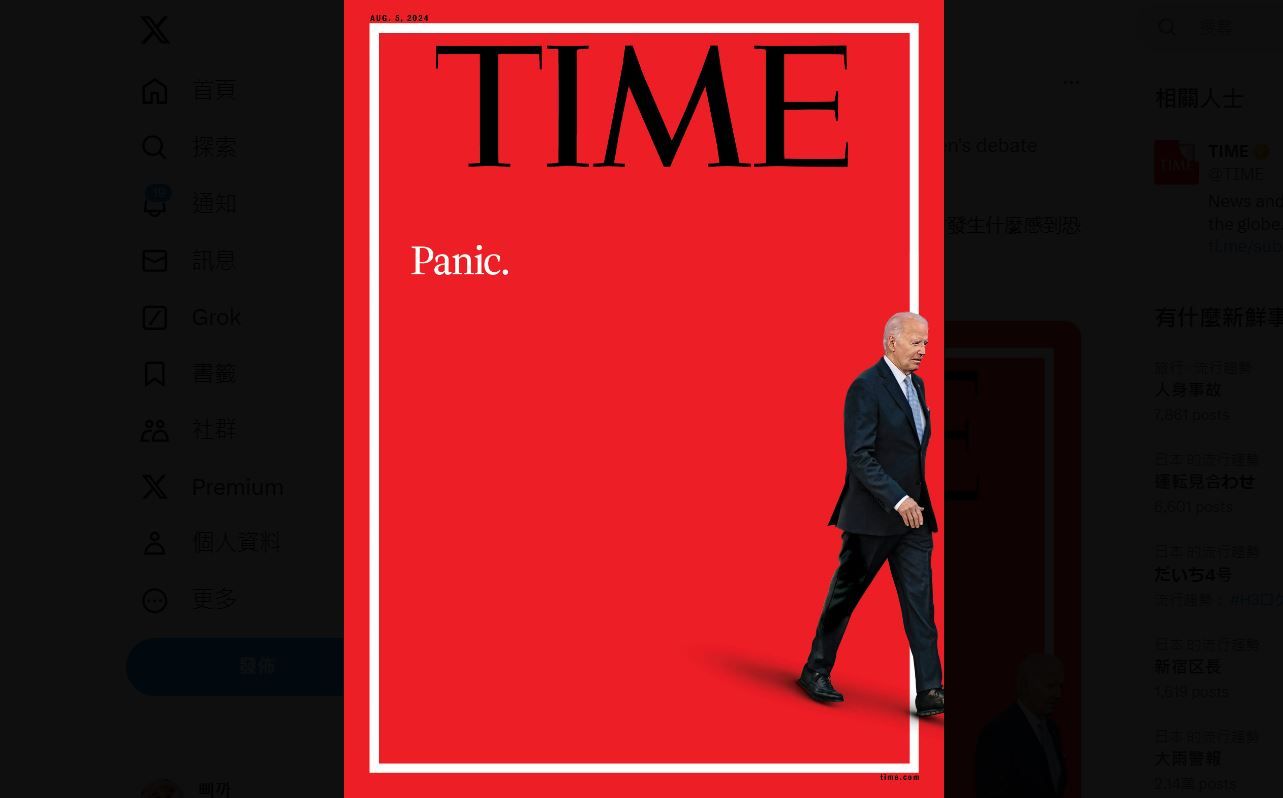 在《時代雜誌》28日於社群媒體公開的8月5日封面中,拜登獨自一人走出鮮紅色背景,配上簡潔有力的標題「恐慌」,強烈的視覺效果和字眼引人注目。封面配文寫道,「事情變得黑暗。」,指出民主黨內部對拜登的辯論表現以及未來走向感到恐慌。