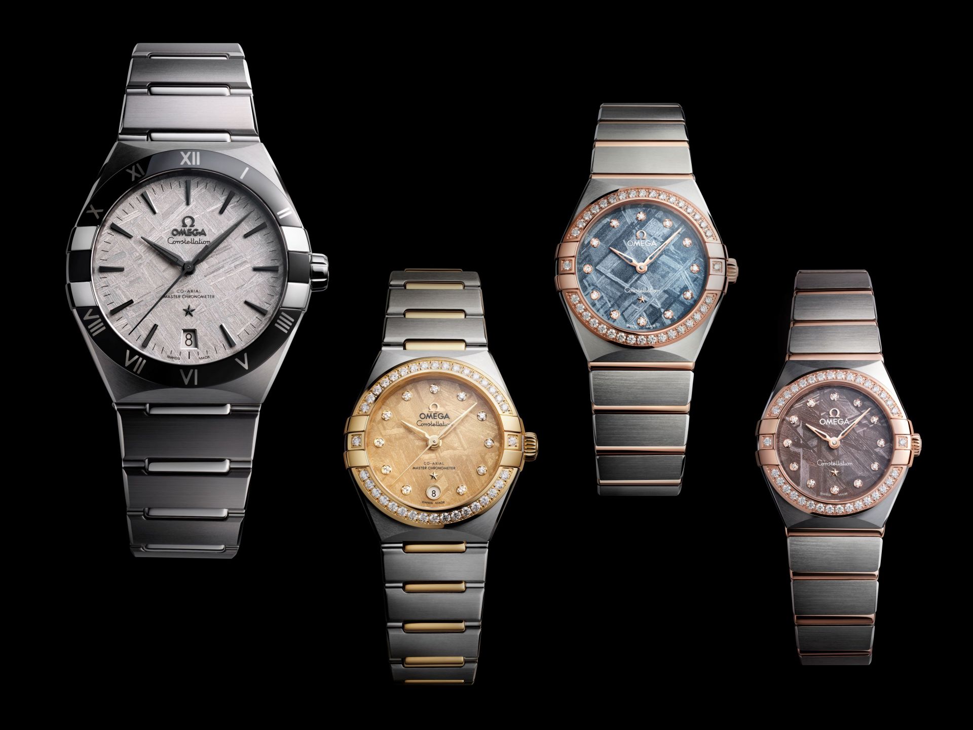 此外,歐米茄還推出了3款秀氣華麗的新錶款,包括不鏽鋼與18K金打造的29毫米同軸擒縱大師天文台機芯錶、不鏽鋼搭配8K Sedna™金的28毫米錶款,以及25毫米錶款。這些錶款的隕石面盤經過PVD Moonshine™金、冰藍色或紫色處理,配上點狀時標和鑲鑽錶圈,展現出華麗而奢華的風采。