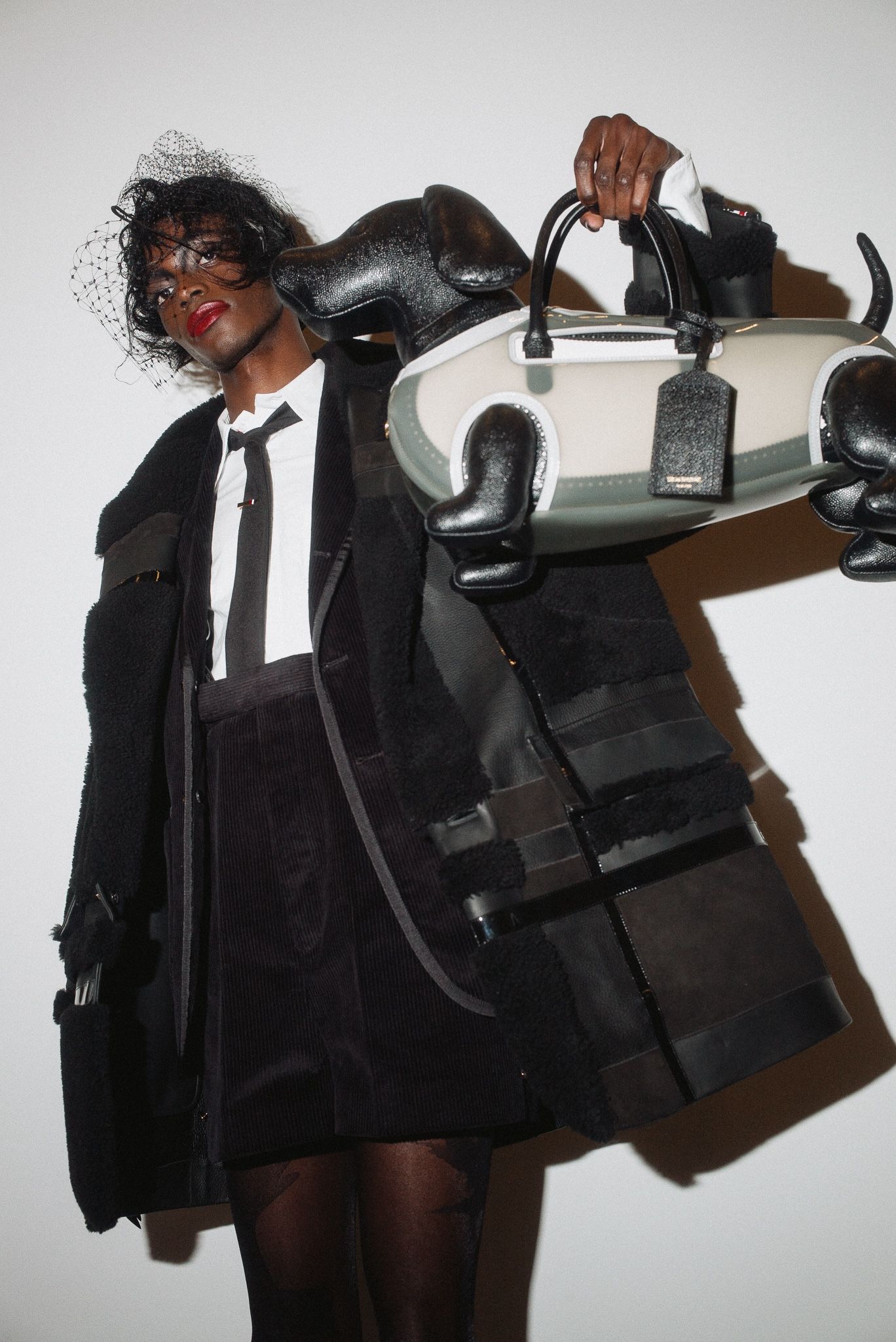 配件方面,高跟鞋和厚底皮鞋都配備了可拆式的防水護套,手袋也同樣具有現代感。尤其是Thom Browne標誌性的狗狗包,這一次穿上了可愛的雨衣,為整個系列增添了一絲俏皮感。