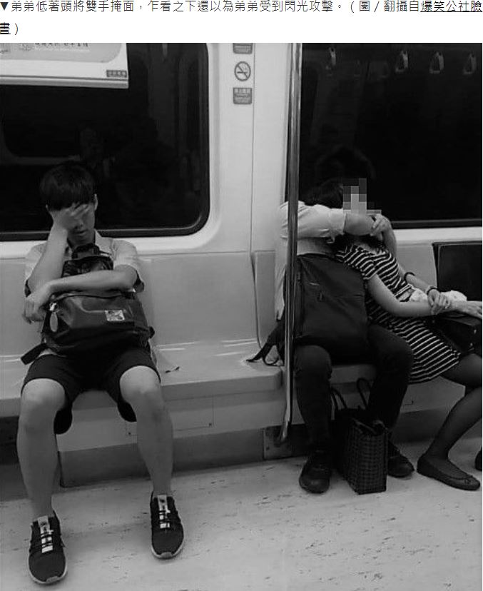 然而,正當網友們投以羨慕眼光時,原貼文者將鏡頭一拉遠,赫然發現兩人不遠處,還坐著一個學生弟弟。只見照片中,弟弟低著頭將雙手掩面,似乎是在休息,但整組畫面卻意外形成強烈對比,乍看之下還以為弟弟受到閃光攻擊,讓原PO開玩笑發文「表情說明了一切!」