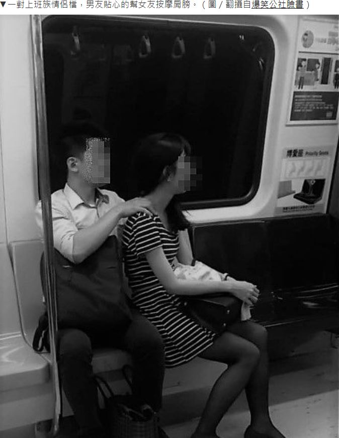 一名網友在臉書「爆笑公社」分享照片,一對看起來是上班族的情侶檔搭捷運返家,男友為了紓解女友一天的辛勞,便開始貼心的幫女友按摩肩膀,照片中女子似乎被另一半按摩得很舒服,便躺在男子身上慢慢閉上眼睛休息;後來男子還直接環抱起女子,兩人互相依偎,畫面閃到不忍直視。
